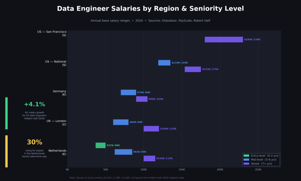 On salaries, the picture in the Netherlands looks like this in 2026. Entry-level data engineers can expect somewhere in the range of €37,000 to €50,000. Mid-level professionals — those with three to six years of experience and hands-on cloud platform skills — typically earn between €62,000 and €85,000. Senior engineers, especially those working in Amsterdam at established tech companies, can command €100,000 to €110,000 or more. The 30% ruling for qualifying expats remains a meaningful factor, effectively increasing take-home pay and helping Dutch employers attract international talent.