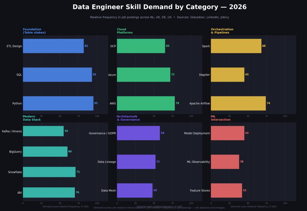 Across all three markets, a clear skills hierarchy is emerging. The foundational layer — Python, SQL, ETL design — is table stakes. Above that, employers are looking for cloud platform depth (AWS, Azure, or GCP), experience with orchestration tools like Airflow or Dagster, and familiarity with the modern data stack (dbt, Snowflake or BigQuery, Kafka or Kinesis for streaming). At the senior end, architectural thinking — understanding data mesh principles, building platforms that other teams can build on, and designing for governance — is what separates good candidates from exceptional ones.